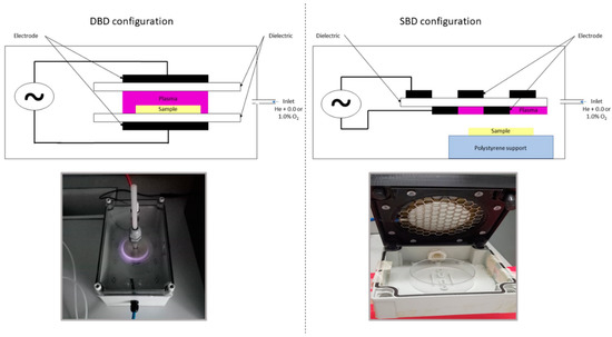 As mentioned before, two electrode configurations were used, i.e., a DBD and an SBD electrode. For both electrodes, the discharge was generated between two electrodes covered by a dielectric layer. The diameters of the electrodes were 5.5 and 5.0 cm for the DBD and SBD configuration, respectively. For both configurations, the dielectric layer had a diameter of 7.5 cm. An enclosure was provided around both electrodes to increase the residence time of the plasma species and to obtain a more controlled environment. Both enclosures (22.5 cm × 13.5 cm × 10 cm and 10 cm × 10 cm × 4 cm for the DBD and SBD electrode, respectively) were not airtight, which resulted in the presence of impurities from the environment. In case of the DBD configuration, the electrode gap was set at 0.8 cm and the sample (or the UV-TEC strip or the small volume of water) was placed between those electrodes. For the SBD configuration, on the other hand, there was no electrode gap and both electrodes were located on the top of the enclosure. Here, the sample (or the UV-TEC strip or the small volume of water) was placed below the two electrodes while ensuring a similar distance between the sample and the electrodes as was the case for the DBD. In Figure 1, a schematic representation of both electrode configurations has been included as well as a photographic image of both specifically used plasma set-ups.