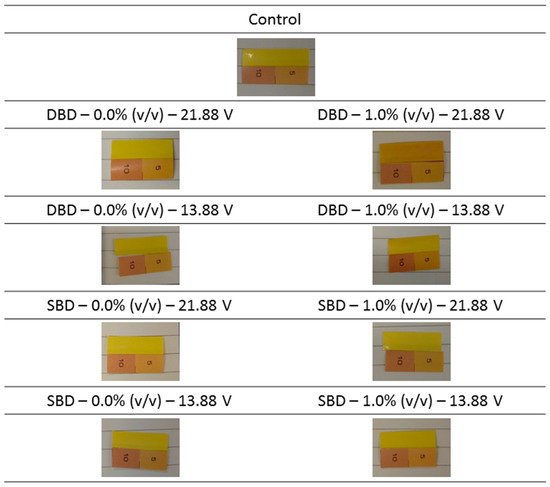 Pictures from the CAP exposed UV-TEC strips have been provided in Figure 2. As mentioned before, the UV-TEC strips were CAP treated for 10 min using different combinations of plasma characteristics. The colors of the CAP treated strips were compared with the untreated control strip and the provided scale bar. Based on this figure, it can be concluded that only one combination of plasma characteristics resulted in a significant color change in comparison to the control, i.e., DBD-1.0% (v/v) O2–21.88 V. For this specific condition, the strips were exposed to approximately 5 mJ/cm2. Assuming a constant photon emission over the course of the applied CAP treatment, which is not fully true, this corresponds to 8 µW/cm2.