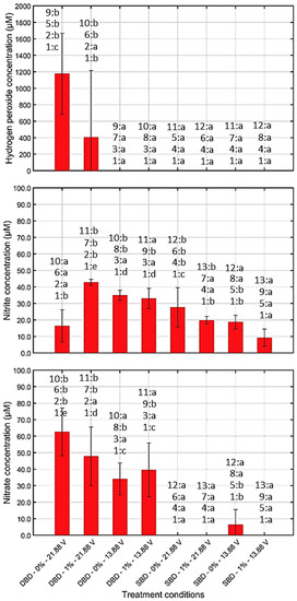 Based on Figure 3, it can be concluded that H2O2 was only formed at two CAP treatment conditions, i.e., while using the DBD electrode and the highest discharge power at both oxygen levels. As a result, the influence of the plasma characteristics on the formation of H2O2 proved to be rather limited, i.e., the DBD electrode is favored over the SBD electrode at the highest discharge power and the highest discharge power is preferred over the lowest discharge power using the DBD electrode. For the nitrite concentration, all treatment conditions resulted in a significant increase in nitrite compared to the control (blanc). The highest concentration was, however, observed while applying the DBD electrode at the highest discharge power and when oxygen was added to the gas flow. Regarding the influence of the plasma characteristics on the formation of nitrite, it can be concluded that there was no clear correlation between the addition of oxygen and the generation of nitrite since the presence of oxygen either resulted in (i) an increased production of nitrite, (ii) no significant differences, or (iii) a decreased production of nitrite. Generally, higher nitrite concentrations were obtained while using the DBD electrode configuration. Only one exception was observed, i.e., at the highest discharge power and without the addition of oxygen. For this specific case, the opposite trend was observed. Finally, generally higher nitrite concentrations were observed at an increased discharge power. Again, only one exception was observed, i.e., using the DBD electrode without addition of oxygen. The formation of nitrate was also influenced by the applied treatment characteristics. Some combinations of plasma characteristics did not result in a significant increase compared to the control (blanc), while up to 60 µM nitrate was formed using the DBD-0.0% (v/v)-21.88 V. The addition of oxygen generally resulted in a decreased generation of nitrate or no significant differences. Moreover, applying the DBD electrode favored the formation of nitrate, and, while using this specific electrode configuration, an increased nitrate concentration was obtained at an increased discharge power.
