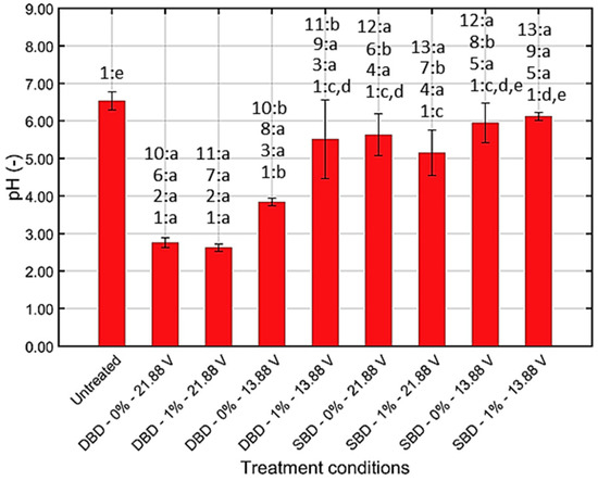 pH values (-) obtained following CAP treatment of 500 µL of sterile water using each possible combination of plasma characteristics (n = 3). Significant differences between all examined conditions (ANOVA test 1), including the untreated control, have been indicated by means of a different small letter, with ‘a’ bearing the lowest value. The influence of the oxygen level (ANOVA tests 2–5), the electrode configuration (ANOVA tests 6–9), and the discharge power (ANOVA tests 10–13) on the pH of the CAP treated water have been indicated as well by means of a different small letter, with ‘a’ again bearing the lowest value.