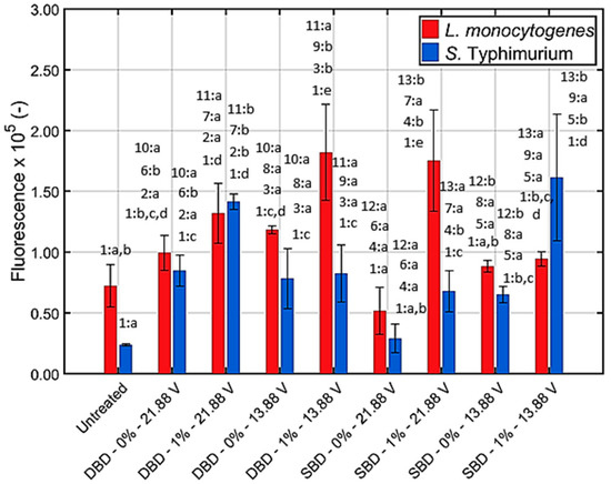 Fluorescence measurements (-) obtained following interaction of SYBR Green I with the CAP treated and digested Listeria monocytogenes and Salmonella Typhimurium biofilm-associated cells (n = 3). Significant differences between all examined conditions (ANOVA test 1), including the untreated control, have been indicated by means of a different small letter, with ‘a’ bearing the lowest value. The influence of the oxygen level (ANOVA tests 2–5), the electrode configuration (ANOVA tests 6–9), and the discharge power (ANOVA tests 10–13) have been indicated as well by means of a different small letter, with ‘a’ again bearing the lowest value. Separate ANOVA tests were again performed for each biofilm forming species.
