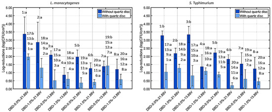 Based on Figure 6, it can be concluded that the log-reductions obtained with the implementation of the quartz disc were quite low, i.e., the values were generally lower than 1 log10(CFU/cm2). Comparing the log-reduction results obtained with and without the implementation of the quartz disc, it can be observed that only two CAP treatment conditions resulted in significant differences for the Listeria monocytogenes model biofilm, i.e., significantly higher log-reduction values were obtained without the quartz disc for SBD-0.0% (v/v)-21.88 V and SBD-1.0% (v/v)-21.88 V. For the Salmonella Typhimurium model biofilms, on the other hand, log-reduction values without quartz disc were generally higher than the corresponding values with quartz disc. Only three exceptions were observed, i.e., no significant differences were observed for DBD-1.0% (v/v)-13.88 V, SBD-0.0% (v/v)-13.88 V, and SBD-1.0% (v/v)-13.88 V.