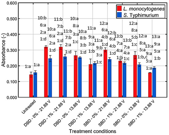 Absorbance measurements (-) obtained following CAP treatment of the Listeria monocytogenes and Salmonella Typhimurium model biofilms (n = 3). Significant differences between all examined conditions (ANOVA test 1), including the untreated control, have been indicated by means of a different small letter, with ‘a’ bearing the lowest value. The influence of the oxygen level (ANOVA tests 2–5), the electrode configuration (ANOVA tests 6–9), and the discharge power (ANOVA tests 10–13) have been indicated as well by means of a different small letter, with ‘a’ again bearing the lowest value. Separate ANOVA tests were again performed for each biofilm forming species.