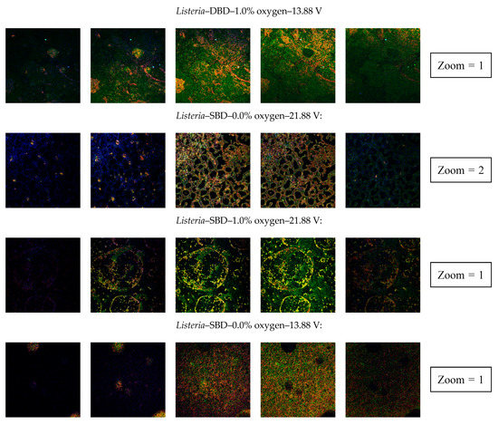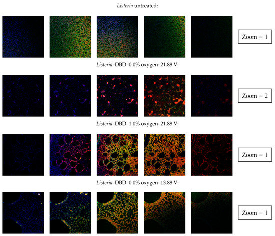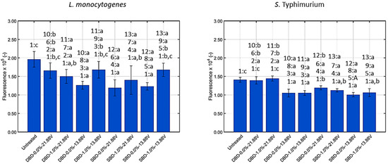 For Listeria monocytogenes, it can be observed that only four conditions resulted in significantly higher fluorescence values compared with the untreated control, i.e., DBD-1.0% (v/v)-21.88 V, DBD-0.0% (v/v)-13.88 V, DBD-1.0% (v/v)-13.88 V, SBD-1.0% (v/v)-21.88 V. Regarding the influence of the oxygen level, it can be concluded that the addition of oxygen favors the creation of intracellular ROS, although not always significantly proven. For the influence of the electrode configuration, the DBD electrode resulted in (significantly) higher values, or no significant differences were observed compared with the SBD electrode. Finally, the discharge power had no major influence on the formation of intracellular ROS when applying the DBD electrode. For the SBD electrode, on the other hand, a lower discharge power was favorable when no oxygen was added, while the opposite trend was observed with the addition of 1.0% (v/v) oxygen.