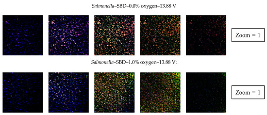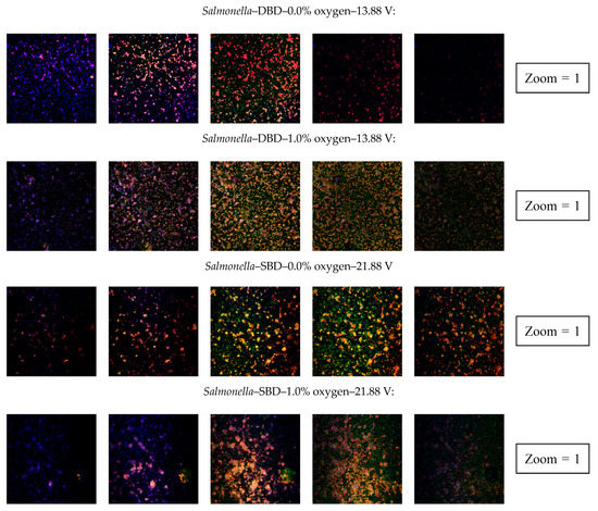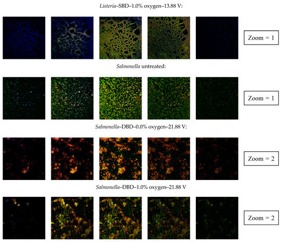Based on Figure 5, it was concluded that the intracellular ROS concentration (significantly) increased when oxygen was added to the gas flow. This means that the oxygen level of the gas flow has an influence on the concentration and/or the type of generated (intra- and extracellular) ROS species. The latter is of high importance as this can have an influence on their ability to penetrate into the biofilm matrix and to interact with the biofilm-associated cells and the EPS matrix. The research of Duan et al. [42], for example, reported that only 5% of the generated ROS species was able to penetrate a tissue with a thickness of 500 µM. Within the presented study, the obtained CLSM images (Figure 9) indicated that all examined treatment conditions resulted in cell death in the deeper biofilm layers. However, this cell damage can also be the result of other reactive species (e.g., RNS). Regarding the effect of the electrode configuration on the intracellular ROS concentration, it can be concluded that the DBD electrode configuration often resulted in significantly higher values in comparison to the SBD electrode. This can also be a consequence of the generally higher dissipated power values resulting in a more efficient generation of different CAP species [17]. In addition, when the SBD electrode configuration is applied, most reactive (short-living) species recombine before they reach the sample. Therefore, fewer species are able to diffuse into the biofilm matrix to eventually interact with the biofilm-associated cells [19,43]. The effect of the discharge power on the intracellular ROS concentration was not very pronounced as this effect was influenced by the oxygen level and the applied electrode configuration. Finally, it was generally observed that the CAP treatment had a more pronounced effect on the intracellular ROS concentration of the biofilm-associated Salmonella Typhimurium cells than for the corresponding Listeria monocytogenes cells. This can be the result of the difference in biofilm matrix composition, allowing different ROS species to reach the biofilm-associated cells [41], and/or by the Gram type of the cells. It has been reported before that the composition of the cell wall of bacterial cells can have an effect on the ability of CAP species to penetrate into the cells. The thick peptidoglycan layer of Gram-positive cells (such as Listeria monocytogenes) still allows the penetration of ROS species, but the diffusion rate is lower as compared to Gram negative cells (such as Salmonella Typhimurium) with a much thinner peptidoglycan layer [44].