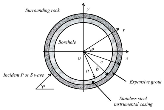 A scattering model of an incident plane elastic P or S wave by a two-ring borehole in an infinite space is given to investigate theoretical frequency response and the corresponding bandwidth for borehole tensor strainmeters, as shown in Figure 1, where the two rings represent the instrument casing and the expansive grout, respectively. The inner radius and outer radius of the stainless steel instrument casing and the radius of the borehole are , , and , respectively. The harmonic plane elastic P or S wave propagating in the plane perpendicular to the axis of the borehole is incident at the incident angle with respect to the direction. Because of the existence of the borehole, grout and instrument casing, two kinds of scattering waves or standing waves (P and S waves) are generated from layer interfaces. The displacement induced by total wave fields around the borehole, which include the incident and scattering wave fields, can be represented in terms of displacement potential of P wave and displacement potential of S wave [28]: