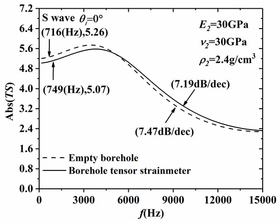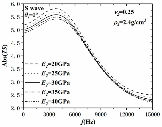 Influence of the Young’s modulus of the expansive grout on theoretical amplitude spectrum of gauge combination TS for the incident S wave.