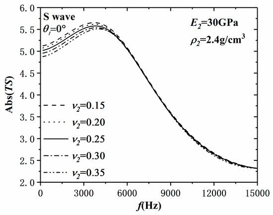 Influence of the Poisson’s ratio of the expansive grout on theoretical amplitude spectrum of gauge combination TS for the incident S wave.
