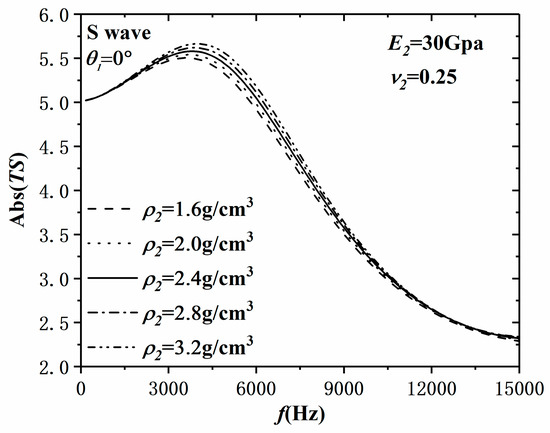Figure 7, Figure 8 and Figure 9 describe the influence of the Young’s modulus, Poisson’s ratio and density of the expansive grout on the theoretical amplitude spectrum of gauge combination TS for the incident S wave, respectively. The changes of the Young’s modulus and Poisson’s ratio cause large changes in the amplitude of FS at small incident wave frequency , while there is almost no change with the different densities of the expansive grout. From Table 6, Table 7 and Table 8, we see that the influence of the Young’s modulus, Poisson’s ratio and density of the expansive grout on FS and TS for the incident S wave are the same as that of the incident P wave, except for the influence of the Poisson’s ratio on the corresponding frequency of peak value.