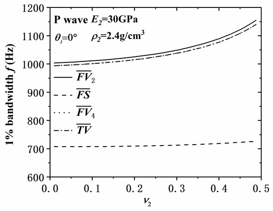 The influence of the Poisson ratio ν2 of the expansive grout on 1% bandwidth of FV2, FV4, TV and FS for borehole tensor strainmeters for the incident P wave.
