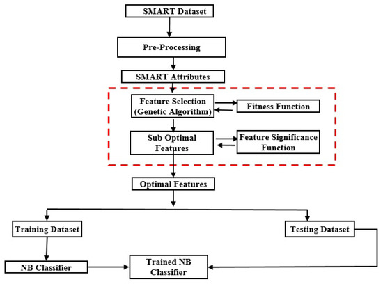 The proposed methodology for detecting failing hard disks is illustrated in Figure 1. It utilizes SMART attributes to determine whether a disk is healthy or failing. SMART attributes are collected by modern HDD for self-monitoring purposes. These attributes are viewed as feature vectors in a high-dimensional space; the dimensionality of the feature space is determined by the number of selected SMART attributes. It is hypothesized that, for healthy and failing drives, these feature vectors will tend to form different clusters, which would be distinguishable in the high-dimensional feature space. A classifier could then be trained to differentiate between these two clusters, and hence determine whether a disk is failing or not using SMART attributes. Nevertheless, not all SMART attributes would be equally helpful in leading to easily separable clusters in the feature space; this would adversely affect the classifier’s performance [25,26]. Hence, feature selection is used to select the optimal subset of features that would result in more compact and clearly separable clusters of vectors of the selected features. In addition to improving the predictive performance of the classifier, feature selection reduces the measurement and storage requirements, as well as the training and prediction times [27]. This study proposes a two-tier approach for feature selection using a GA and feature significance function.