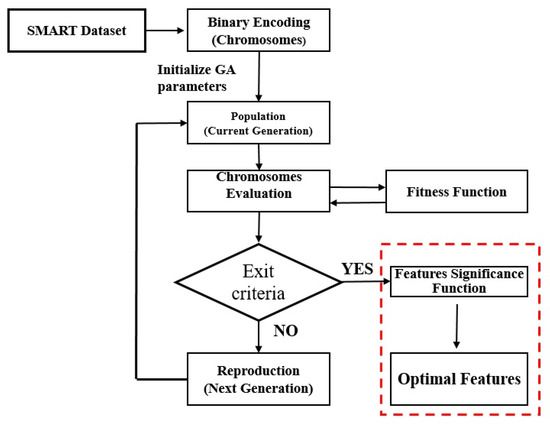 The proposed two-tier approach for feature selection using a GA and feature significance scores is illustrated in Figure 3. The GA requires the SMART attributes or features to be encoded into chromosomes. New chromosomes are generated from old ones using the mechanism of mutations and crossovers. The newly generated chromosomes replace their parents, provided that they are better, i.e., they perform better compared to their parents in terms of the fitness or objective function, as discussed earlier. This process of generating new chromosomes and selecting the best among them to replace the ones in the last generation is iterated multiple times until the fitness function reaches an asymptotic value with further iterations yielding no improvement in the fitness function [27].