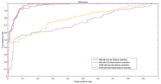 The ROC curves in Figure 4 clearly indicate that the NB classifier trained on the nine features selected by the proposed two-tier feature selection process yields the best results in terms of both the TPR and FPR. When compared to existing methods for detecting failing hard disks, the proposed method offers distinct advantages. Wang et al. [18] presented a two-step parametric method, which utilizes 47 critical features, identified in [17] for failure prediction in HDD, as opposed to the nine SMART attributes determined in this study. They tested their method on a dataset that was collected for 369 hard disks of a single model, and contained data only for the last 600 h, where each sample of data are 2 h apart from the next one. Thus, for each drive, a maximum of 300 values are available for each of the 47 features. Among the 369 drives, 178 drives are healthy, while 191 are failed drives. Given the variation in failure rates across different models and across different storage capacities for certain models, as observed in commercial datacenters [41], this dataset cannot be considered a representative dataset. In contrast, as discussed in Section 2, the proposed method is tested on a more extensive and more representative dataset. The method proposed in [18] could achieve a failure detection rate (FDR) or TPR of % at a FAR of 0%, and an FDR of around 95% at a FAR of around %. However, the FAR is highly sensitive to the failure threshold and no mechanism has been provided to set an appropriate failure threshold. This is an important concern because the ineffectiveness of the simple thresholding technique put in place by drive manufacturers to detect a failing hard disk was a major reason why considerable interest was generated among researchers to devise better methods for detecting failing disk drives. The proposed method uses a two-tier feature selection process, and determines the nine SMART attributes given in Table 2, to be the most effective precursors to a failing HDD. This reduces the training time of the classifier. Using the values of the nine selected SMART attributes for 2065 hard disks, the proposed method yields an FDR of % at a FAR of %, without using any arbitrary parameters. Among the 2065 hard drives, 1500 are healthy and 565 are failed drives. These are divided into three folds, with 688, 688, and 689 hard drives, respectively. Each fold contains 500 healthy drives, whereas the remainder are failed drives. The proposed method correctly detects 185 of the 188 failed drives with only false alarms on average. Moreover, the proposed algorithm can also be used for the online diagnosis of HDD. A trained instance of a NB or SVM classifier can be provided with the values of the nine SMART attributes of an HDD, as listed in Table 2. The output of the classifier can then be interpreted as either a healthy HDD or one with an impending failure.