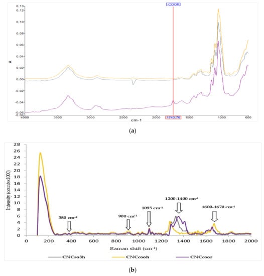 (a) Fourier-transform infrared spectroscopy (FTIR) spectra of the three types of cellulose nanocrystals (CNCs): CNCSO3H (yellow), CNCCOOR (violet) and CNCCOOH (green). (b) Raman analysis of the three CNCs productions: CNCSO3H (yellow), CNCCOOH (green) and CNCCOOR (violet).
