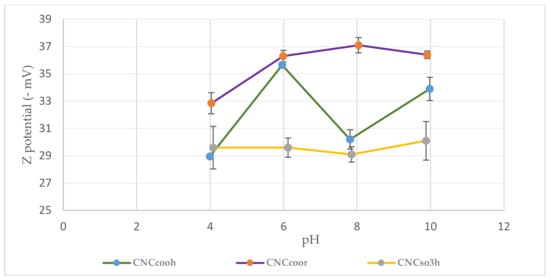 Z potential values versus pH of CNCs with carboxylic (CNCCOOH), sulfate half ester (CNCSO3H) and ester groups (CNCCOOR).