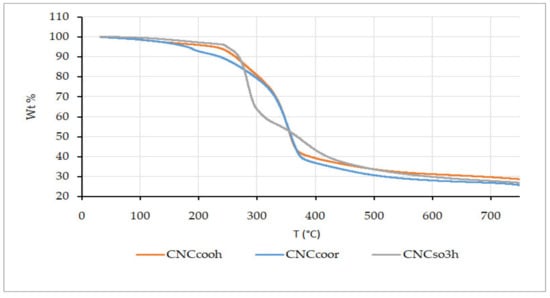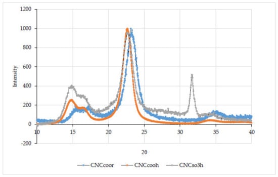 From the Raman spectra (Figure 1b), the band at 900 cm−1 in the spectra of cellulose is known to be associated with increased disorder [31], and therefore it was hypothesized that CNCCOOH were less ordered, due to their negative charges. Moreover, the regions (1200–1400 cm−1) are attributed to ─CH3 bending and ─COH in-plane bending motions. The bands in that region were sharper and less intense in CNCSO3H, with respect to CNCCOOH and CNCCOOR. More importantly, calculated X785-Ram values, which represent the degree of crystallinity, were 63.7%; 62.64% and 60.14% for CNCCOOR, CNCCOOH and CNCSO3H, respectively. Such similar values showed that the esterification did not affect the degree of crystallinity of the CNCs significantly. Even though Raman spectra showed differences between the three types of crystals, carbonyl groups (carboxyl and ester) were not detected, and that might be attributed to the interference of the water. Future investigations have to be carried out in order to find out the impact of the concentration of the colloidal suspension of CNCs on the measurements.