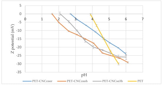 Z potential and contact angle were employed to assess the hydrophobicity of uncoated and CNCs-coated PET films. From the data reported in Figure 5, PET films coated with the three types of cellulose nanocrystals showed similar behavior, Z potential increases with the increase in pH values. Uncoated PET film has its isoelectric point at pH 4 while PET films coated with CNCSO3H, CNCCOOH and CNCCOOR have their isoelectric point at pH 1.6, 2.08 and 2.7, respectively. According to analytical instrumentation and data interpretation (Surpass TM 3), the isoelectric point found at a pH close to 4, and lower Z potential values found at pH ≈6, indicate that the material exhibits less charges density. Based on the above, uncoated PET film appeared to be the material, which exhibits the lowest charges density followed by PET-CNCCOOR, PET-CNCSO3H and PET-CNCCOOH.