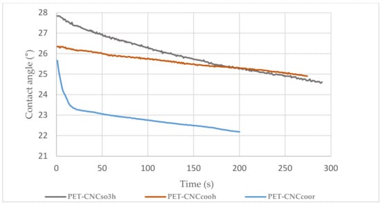 In contrast, the hydrodynamic water contact showed a different behavior (Figure 6). There was an immediate decay in water contact angle of PET films coated with esterified CNCs. It was observed that the drop of water was not absorbed by the CNCCOOR coated PET film, but it just expanded rapidly on the surface. PET films coated with CNCSO3H and CNCCOOH have similar trends and decay rate over measurement time.