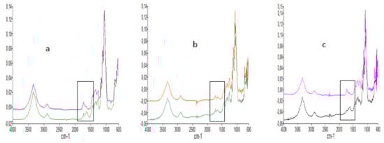 The corona treatment was aimed at offsetting the lack of affinity and reinforcing the adhesion between CNCs and adhesive. As outlined in Figure 7a–c, the peaks formed during the corona-treatment can be observed. The ozone treatment usually oxidizes functionally chemical groups of the cellulose nanocrystals surface. However, that oxidation was less pronounced in the already-oxidized cellulose nanocrystals (CNCCOOH), while it was much more marked on esterified CNCs (CNCCOOR) and CNCSO3H surface (Figure 7a–c), with the formation of carbonyl groups (carboxyl and ester) between 1645 cm−1 and 1750 cm−1. These polar groups would contribute to improve the adhesion between CNCs coatings and the polyurethanic adhesive.