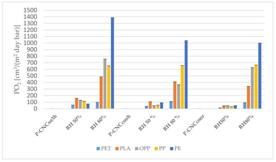 The lamination technique was very effective in blocking water from the surrounding environment to disrupt or modify the crystallinity network of the cellulose nanocrystal’s coatings. In addition, gas barrier properties were not lost after the lamination, and that proved the excellent chemical affinity between the adhesive and the CNCs. The combination of both techniques, i.e., chemical modification and lamination, to mitigate the swelling of the coatings of cellulose nanocrystals surface resulted the most effective approach to strongly enhance the gas barrier properties even at higher relative humidity. It bears observing that sealable and hydro-repellent plastics, such as PP and PE, showed better O2 under 50% and 80% RH, compared to PLA, which is a water sensitive polymer. To this regard, however, CNCCOOR proved their effectiveness in reducing the PLA oxygen permeability. In particular, they reduced the permeability by a ten-fold factor with respect to CNCSO3H at 50% RH, but positive effects were also recorded with respect to CNCCOOH even at 80% RH.