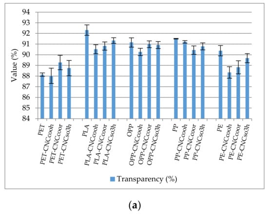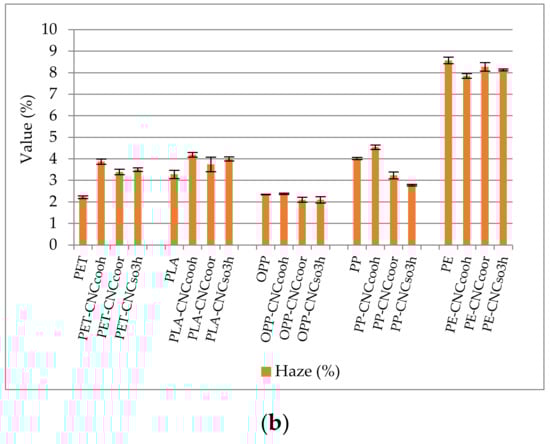 Uncoated and CNCs-coated polymers (P-CNC) showed similar values of haze and transparency, proving that the coating of polymers with the three types of polymers has not significantly affected the optical properties the original plastic films (Figure 9a,b). However, the haze values of coated and uncoated PLA and PE films were slightly different, and this was attributed to their chemical-physical modification, which occurs during the corona treatment. More importantly, the esterification did not modify the optical properties of the cellulose nanocrystals.