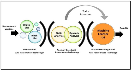 To thwart ransomware families and their corresponding versions, researchers have developed various anti-ransomware technologies during the last decades, and they categorized them into misuse-based technology, anomaly-based technology, and machine learning-based technology [6,14,15,16], as described briefly in Table 2. For a clear description, we illustrate the categories above, along with their advantages, are presented in Figure 2.