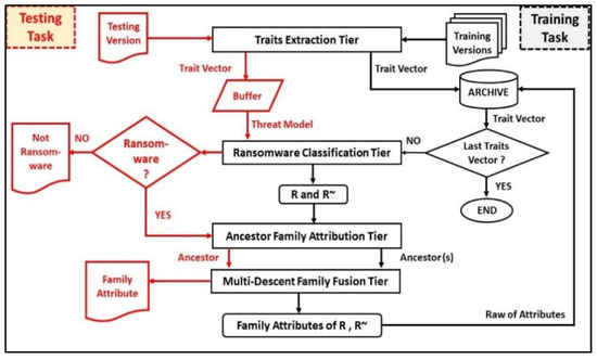 The diagnoses of ancestor family and multi-descent families that are pursued by family attribution and multi-descent fusion tiers are implemented synchronously along with learning done by the hybrid machine learner in the learning tier. So far, the proposed ransomware streaming analytics model carries out the aforesaid multi-tiers in a multi-disciplinary manner across data, trait space, header data, and predictive classes during both the training and testing tasks, as shown in Figure 3. Thus, the input (unknown) ransomware version is analyzed on its runtime during the testing task of the proposed multi-tiered streaming analytics architecture as the same as the data of the training corpus but in a different order. The training task can be traced by the black path, whereas the testing task is tracked throughout the red path, as it can be seen in Figure 3.