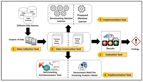 This section elaborates the experimental workflow that is conducted for the purpose of performance assessment along with the description of data corpora and evaluation metrics as well as the discussion of obtained results. As illustrated in Figure 4, the experimental workflow is conducted through several tasks, including a collection of data, construction of data into training corpus and testing corpus, implementation of the benchmarking machine learners as well as the proposed machine learner (HML). In addition, the experimental workflow pursues the implementation task of the benchmarking anti-ransomware tools and the proposed ransomware multi-tiered streaming analytics model. Then, the evaluation task is carried out to qualify the overall experimental results and to justify the asserted findings.