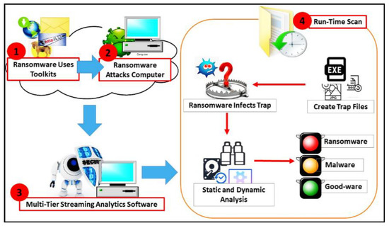 Motivated by fame and illegal profit, cyber-criminals have threatened users’ privacy and information systems by ransomware attacks [1]. Thus, different anti-ransomware tools and anti-malware software have been developed to detect ransomware attacks of various ransomware families on desktop and portable platforms [2,3]. Along with them; are the anti-ransomware tools assisted by machine learning that learn ransomware data with a set of static and/or dynamic traits to examine ransomware attacks at their runtime successfully [3,4]. Although they perform better than their competitors, machine learning-based anti-ransomware tools still suffer from late ransomware tackle, somewhat incorrect categorization of a ransomware family among other malware families, variable performance outcomes versus various ransomware families, complex computations, and longtime reaction with heavy use of CPU and memory [4,5]. Accordingly, they still provide a chance of evasion to the cyber-criminals who advance their exploitations to evolve 0-Day versions of new ransomware families every day [6]. Then, more users’ data loss, systems’ data leakage, and users’ money loss would be produced along with other tragic concerns to cyber-security [4,5,6]. Since data protection, systems’ defense, and cyber-space survival is the superior aim of researchers in cyber-security [7]. A more proficient scheme to detect ransomware attacks in their runtime is required to overcome the previous issues of the existing anti-ransomware tools. The required solution should be efficacious with less performance overhead, and adaptive to operate on desktop and portable platforms of servers, PCs, tablets, and smartphones. Furthermore, it should identify the ransomware version among the generic versions of malware and good-ware apps as well as categorize its corresponding family decisively. In addition, it should analyze both crypto and locker ransomware families automatically to extract their static and dynamic traits that discriminating against them from other malicious families and good-ware apps with light use of CPU and memory.