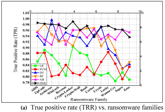 - Hybrid machine learner. The evaluation outcomes in Figure 6, Figure 7, Figure 8 and Figure 9 restated that the proposed HML was more competent among its competitors. This was attributed to (i) its dual inductive function that is a hybrid of NB and DT functions, and (ii) its adjustable decisive boundary that is complementary of numeral and statistic metrics, AR and MDR. Accordingly, it achieved higher detection rates than others against the versions of ever-seen and/or never-seen ransomware families on big and different corpora of data.