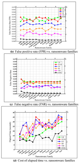 - Unaware of family attribution. Escalated ransomware streams from 2005 to 2019 yield more than 30 different ransomware families of both locker and crypto types [21,24,34,35]. This is attributed to the availability of e-services, social engineering, and primitive ciphering technologies that enable cyber-criminals to advance their ransomware without sophisticated knowledge [21,24]. However, the big stream of ransomware versions might share mutually inter-related traits that cause overfitting to decisive margins of machine learners and then limited detection against some ransomware families with high rates of FNR, as shown in Figure 6.