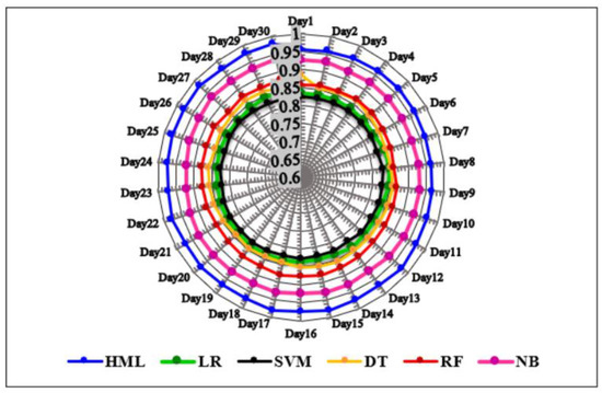So far, we attempt to investigate how do state-of-the-art machine learners, as well as the proposed HML, can leverage the issues above in the realistic environment against 0-Day ransomware versions. Such investigation points out the effects of real-life data corpus that might contain many different and daily emerged versions of cyber-attacks, including ransomware, malware, and good-ware. Almost cyber-attacks are of a multi-descent family; for example, malicious and ransomware attacks. The existence of cyber-attacks causes an abundance of attacks’ versions, imbalance in those versions’ classes, variety in versions’ ancestor families, and versions’ multi-descent families as well as their commonness in their latent traits and dynamic behaviors that are suggested by this work. Thus, a third comparative experiment is conducted in the realistic mode during one month (specifically from 1 November to 30 November 2019), and its outcomes are evaluated by the scores of AUC as they are plotted in Figure 8.