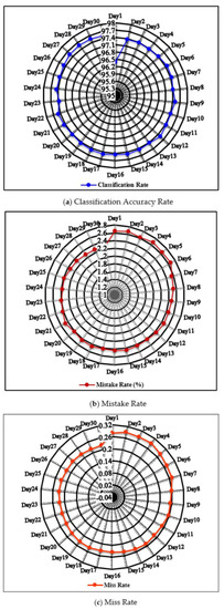 Besides the previous comparative experiments, a daily based test is conducted in a realistic environment to evaluate how the proposed ransomware streaming analytics model manifests its efficacy against different and 0-Day ransomware versions of those of different ancestor-families and multi-descent family. The plotted charts of Figure 9 demonstrate the detection ability and holistic characterization of the proposed ransomware streaming analytics model with minimal performance overhead through its multi-tiered design versus daily escalating/deescalating and/or imbalanced corpus of data during one month. Unlike the anti-ransomware tool RANDS, which is devoted to our previous work [34,35], a minor escalation or de-escalation of efficacy’s trend line is reported by our proposed ransomware streaming analytics model at certain days (see Figure 9). This is due to its attitude in solving the problems of the multi-descent family case as well as ancestor family attribution by using numeral and statistic metrics that are pursued by the proposed HML. Furthermore, the proposed ransomware streaming analytics model achieves shorter elapsed time than that of RANDS in [34], as shown in Figure 9d, due to its minor consumption of CPU and memory.