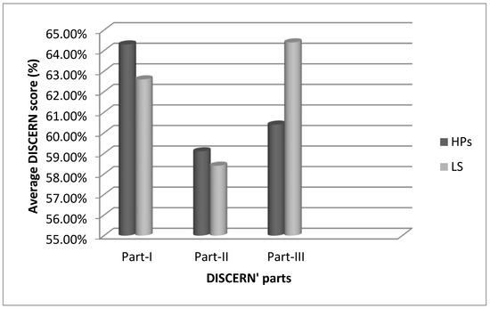 In this section we compare the analysis of Group 1 and Group 2 to evaluate the two-group results. Section wise comparison of the DISCERN questionnaire by HPs and LSs is shown in Figure 6. It is clear from the figure that the assessments of part-I and part-II of the DISCERN questionnaire in both groups are closely related compared to a slightly greater difference in part-III of the questionnaire where HPs (Group 1) achieved 60.4% and LS (Group 2) achieved 64.4% average DISCERN scores.