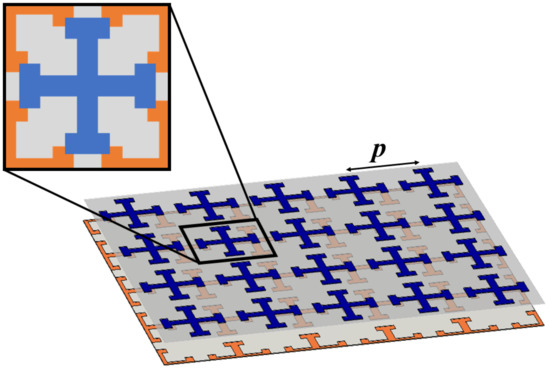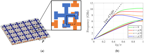 A periodic structure is glide-symmetric if it is invariant under a translation and a reflection. A 2D glide-symmetric structure implemented in a parallel plate waveguide (PPW) is exemplified in Figure 1. The inset displays a top view of the unit cell. The displacement between the discontinuities in the top and bottom plates is , where p is the periodicity.