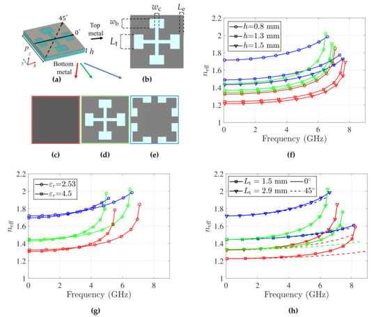 Dispersion analysis for the dielectric parallel plate waveguide loaded with Jerusalem cross slots. The unit cell is illustrated in (a) perspective view, and (b) top view. Three unit cell configurations with different bottom metallic conductors are studied: (c) conventional, (d) mirror-, and (e) glide-symmetric. Effective refractive index for different values of: (f) the substrate thickness, h, (g) the substrate permittivity, εr, and (h) the parameter Lt. The level of isotropy is illustrated in (h). The red, green and blue curves correspond to the conventional, mirror- and glide-symmetric unit cells. The parameters are (unless otherwise specified)