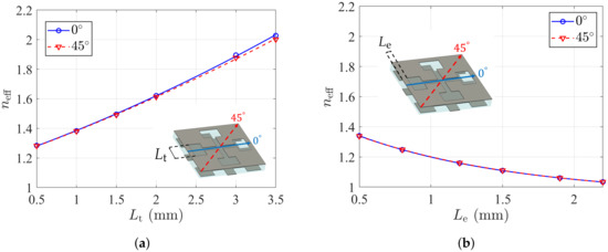 Effective refractive index at 5 GHz for a parametric sweep of: (a) Lt and (b) Le. The blue and red line represent a wave traveling in the 0° and 45° directions, with respect to the x-axis. The effective refractive index is normalized with . The parameters are mm (Figure 4a), mm (Figure 4b), mm, mm (Figure 4a), mm (Figure 4b), mm, mm, and .