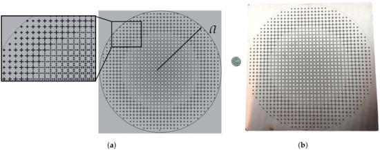 where is the refractive index of the surrounding media, a is the radius of the lens and r is the radial position in the lens. The refractive index must range from to . Such variation can be achieved with the glide-symmetric structure by varying the parameters and , as illustrated in Figure 4. The refractive index profile (1) is realized by spatially varying and throughout the lens. A rendition of the lens is presented in Figure 5a. The radius of the lens, a, is 130 mm. The prototype of the lens is displayed in Figure 5b and it is manufactured on a mm thick Teflon substrate ( and ).