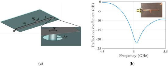 Simulation results of the matching circuit: (a) 3D model and (b) reflection coefficient when loaded with a dielectric PPW. The manufactured prototype is presented in the inset. The dimensions are mm, mm, mm, mm, mm and mm. The circuit is manufactured on a 0.8 mm thick Teflon substrate ( and ).