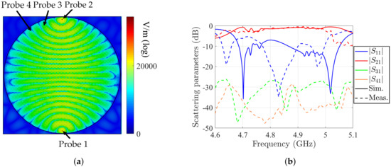 The simulated and measured scattering parameters are presented in Figure 7b. The simulation and measurement agrees well, apart from a slight frequency shift. However, since the distance between peaks in the is similar in the simulations and measurements, the reflections occur at the same location in the structure. The frequency shift is accounted for by the error margin in the relative permittivity of the substrate. The measured has a peak value of −0.5 dB and it is above −3 dB from 4.63 to 5.03 GHz. The bandwidth depends on the refractive index variation and the feed design. Two more probes are connected to the lens at the same radius as the feed probe, but displaced and from the image point. The measured transmission coefficients to these probes are also included in Figure 7b and are below −25 dB.