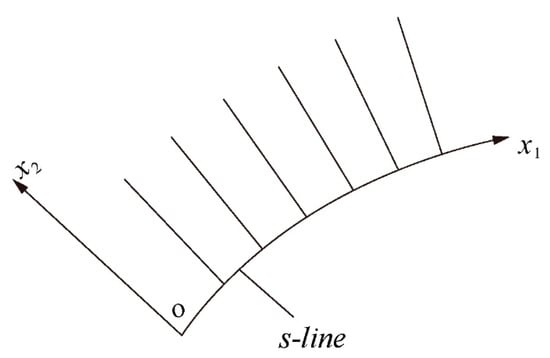 Let be an orthogonal coordinate system in planes of flow. The coordinate curves are straight (Figure 1). Then, it is possible to assume with no loss of generality that the scale factor of these coordinate curves is unity. The scale factor of the coordinate lines may be represented as