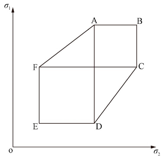 There are several flow regimes associated with difference faces and edges of the Mohr–Coulomb yield criterion (Figure 4). One of the principal stresses is the circumferential stress . The other principal stresses are denoted as and . It is assumed that . In this case, there are two regimes in which the hypothesis of Haar and von Karmen, that or , is satisfied. These regimes correspond to point A and F in Figure 4. Using (3) the yield criterion can be represented as