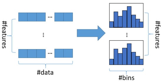 The basic idea of the histogram algorithm is to discretize continuous floating point features into k integers, and to construct a histogram with a width of k at the same time. When the data are traversed, statistics is accumulated in the histogram with the discretized value as index. After the data are traversed once, the histogram accumulates the required volume of statistics, and then the optimal segmentation point can be found through traverse according to the discrete value in the histogram, as shown in Figure 1: