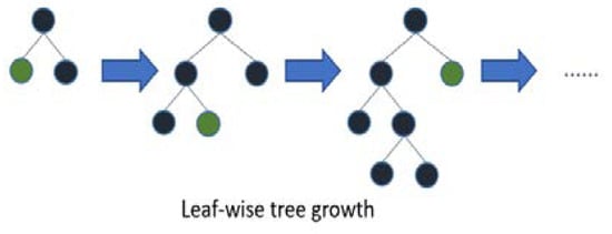LightGBM uses a leaf-wise growth strategy with a depth limit to find a leaf node with the largest split gain in all of the current leaf nodes, then splits, and so on, as shown in Figure 3: