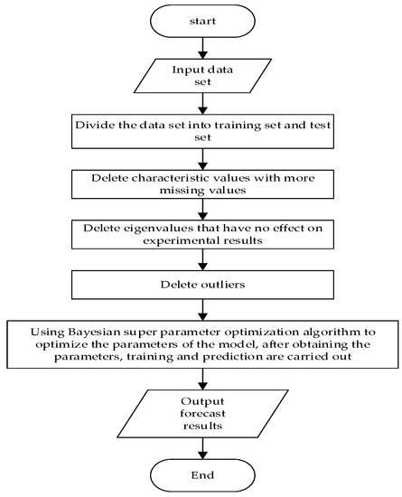 The basic idea of the Bayesian hyper-parameter optimization algorithm is to establish a substitute function based on the evaluation result of the past objective to find the minimum value of the objective function. The substitute function established in this process is easier to optimize than the original objective function, and the input value to be evaluated is selected by applying a certain standard to the proxy function [25]. Although the genetic algorithm is currently widely used in the parameter optimization of machine learning [26,27,28,29], its disadvantages are also obvious, such as a poor ability of local search, many control variables, a complicated process, and no determined termination rules. The random searching algorithm is a traditional parameter optimization algorithm in machine learning [30]. It uses random sampling within the search range for parameter optimization, but the effect is poor when the dataset is small. In contrast, Bayesian hyper-parameter optimization takes the result of the previous evaluation into account when trying another set of hyper-parameters, and has a simpler process of optimizing model parameters than the genetic algorithm, which can save a lot of time.
