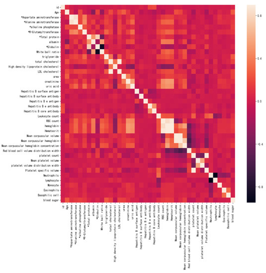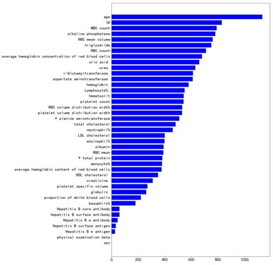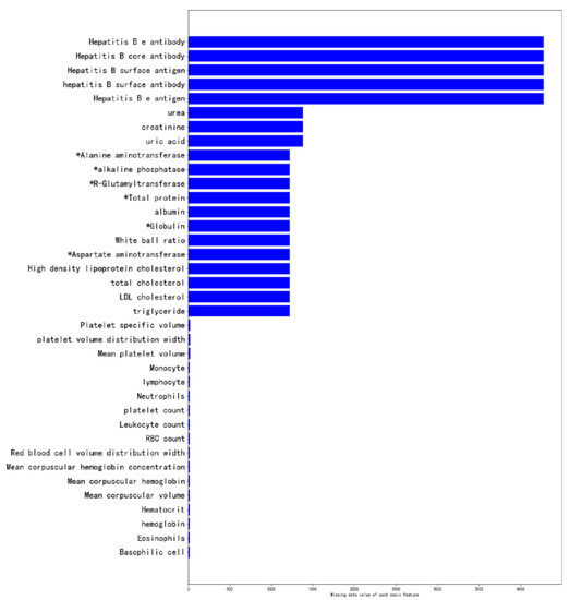 Firstly, the missing values in the original dataset were analyzed to obtain the proportion of the missing data. It can be seen from Figure 6 that the missing proportion of five basic features—hepatitis B surface antigen, hepatitis B surface antibody, hepatitis B core antibody, hepatitis B e antigen, and hepatitis B e antibody—is over 70%, significantly exceeding the missing proportion of other basic features. Therefore, these features with large missing values were deleted, and those with smaller missing values were filled with medians.