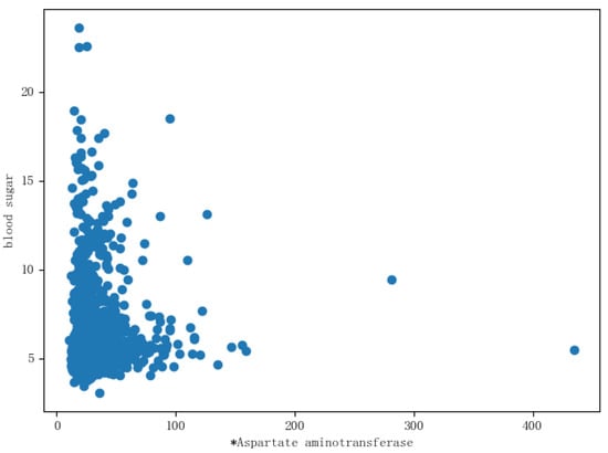 Finally, the basic features and the distribution of the blood glucose levels were learned, which can provide a more intuitive reference for feature engineering. The blood glucose values were used as the Y-axis coordinates and the other basic features as the X-axis coordinates. Each basic feature and the distribution of the blood glucose value were listed for analysis, as shown in Figure 9, where aspartate aminotransferase and the distribution of blood glucose are displayed. It can be seen from the figure that the distribution of the blood glucose value in aspartate aminotransferase included outliers, so the outliers were deleted. The outliers of the remaining features were also deleted.