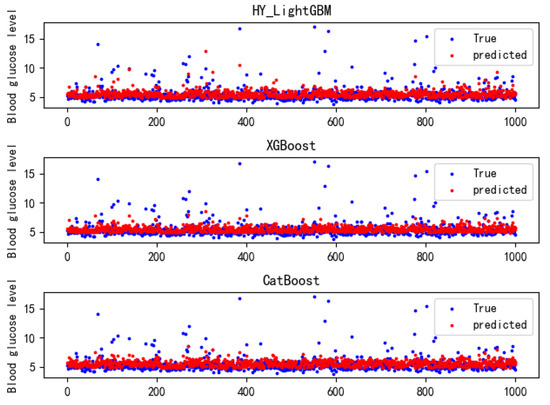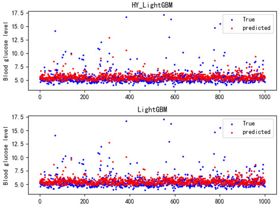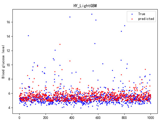 After the parameter optimization of the LightGBM model by the Bayesian hyper-parameter optimization algorithm, the parameters of the LightGBM model obtained were set as follows: the learning_rate was 0.052 and the number of basic learners n_estimators was 376. The minimum row tree that the leaf may have, the tree min_data_in_leaf, is 18. The ratio of data used in each iteration bagging_fraction was 0.9, and the ratio of randomly selected features in each iteration feature_fraction was 0.5. This set of optimal parameters of the LightGBM models were input into the LightGBM model to predict the blood glucose value. The experimental results are shown in Table 3. The scatter diagram of the actual blood glucose values and the predicted blood glucose values is shown in Figure 10.