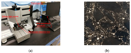 The experiment was carried out according to ASTM C457 [40]. Firstly, the concrete specimen was sliced into surface parallel sections with a size of 100 × 100 × 20 mm and polished with a silicon carbide-glycerol suspension. Then, the polished samples were washed in absolute ethanol by ultrasonic wave and oven dried at 40 °C for 24 h. When they cooled down to room temperature, their polished surfaces were blackened with ink and dried at 60 °C for 30 min. Then, a rubber knife was used to coat zinc oxide evenly on the polished surface (the mass ratio of zinc oxide to Vaseline was 1:3), so that it could be integrated into the air-voids. After the sample cooled down, excess zinc oxide on the surface was scraped off with a rubber knife to make sure only the air-voids were filled with zinc oxide, and the rest of the surface was black, shown as Figure 4b. Finally, the samples were put into a protection box for testing.