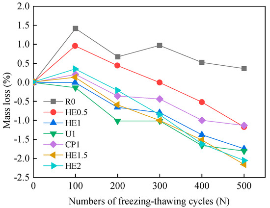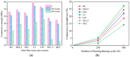 Figure 5 illustrates the impact of the type and content of steel fibers on compressive strength of CGAC before and after F-T cycles. According to the Figure, the mass loss increased rapidly with the increase of freeze-thaw cycles. After 500 freeze-thaw cycles, compared to the R0 mixture with a mass loss of 24.46%, HE1.5 and HE2 mixtures had a mass loss of 27%, while that of HE0.5 and HE 1 were relatively small. The water in the capillary pores of CGAC expanded during its freezing, resulting in formation of microcracks when the expansion force was greater than the tensile strength of the concrete. With the increase of F-T cycles, the microcracks propagated and formed macrocracks, decreasing the concrete strength. In this case, the steel fibers incorporated into CGAC could partially bear the expansion force, which limited the propagation of microcracks, and decreased the strength loss of the concrete. However, the increase of steel fiber content decreased the workability of concrete, and led to steel fiber balling and free water trapping, causing higher air void ratios and more internal defects, thus increasing compressive strength loss of CGAC after F-T cycles [41].